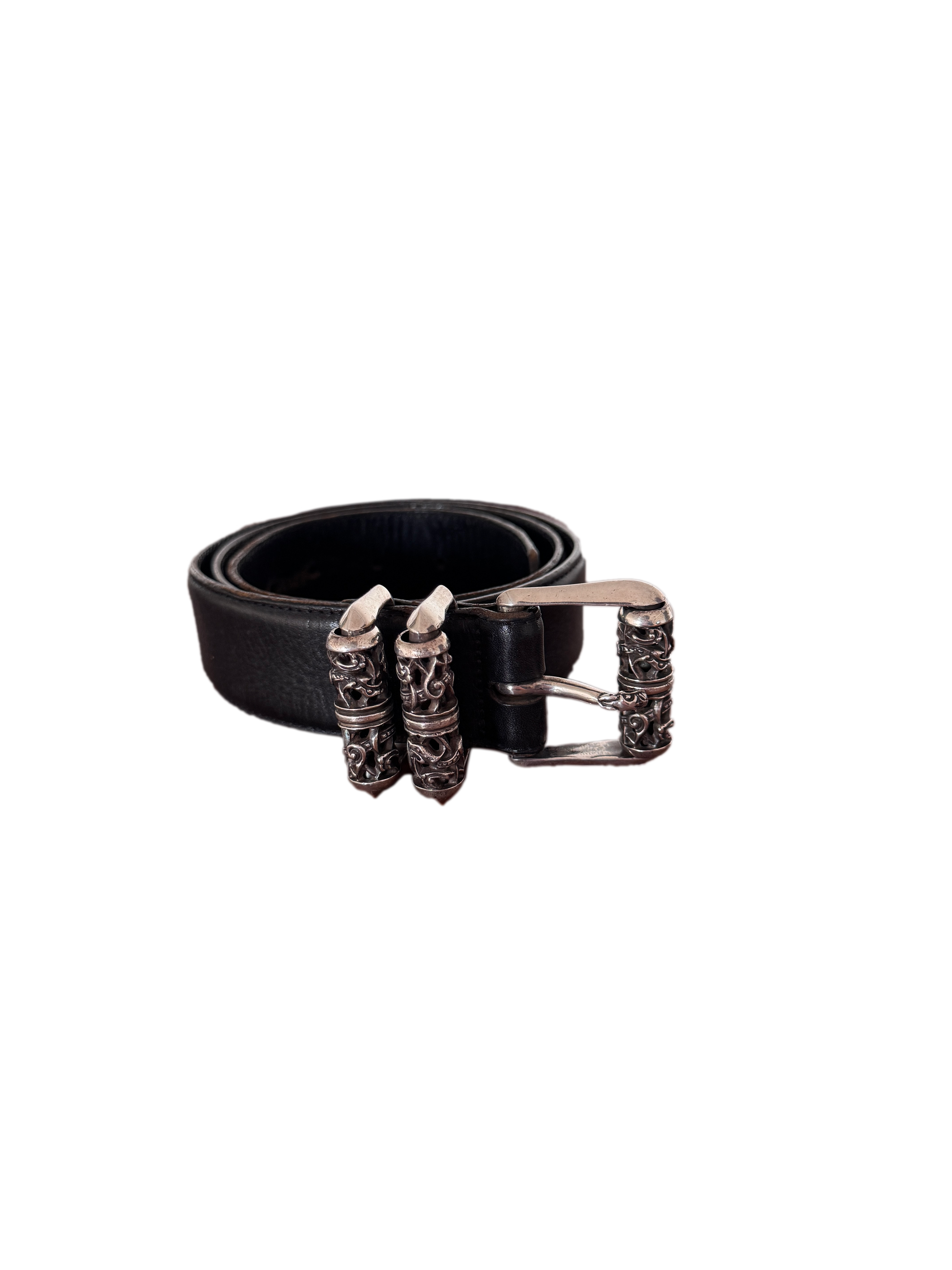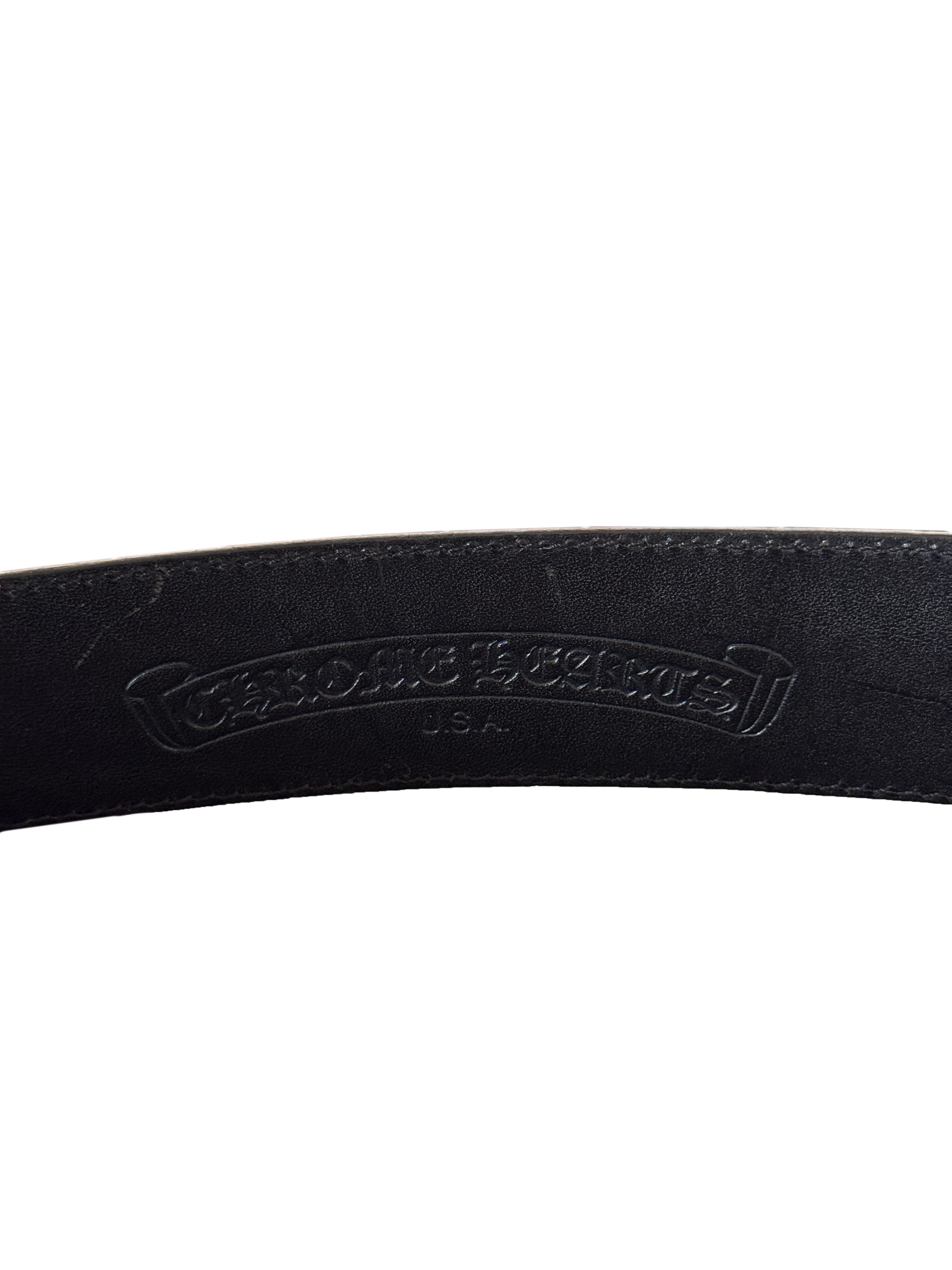 One of the most in-demand belts from Chrome Hearts. Traditional 3 piece roller with celtic motif hardware. Marked size 34, fits between a 30-34" waist. Condition is like new - silver is untouched, minimal signs of usage on the leather.