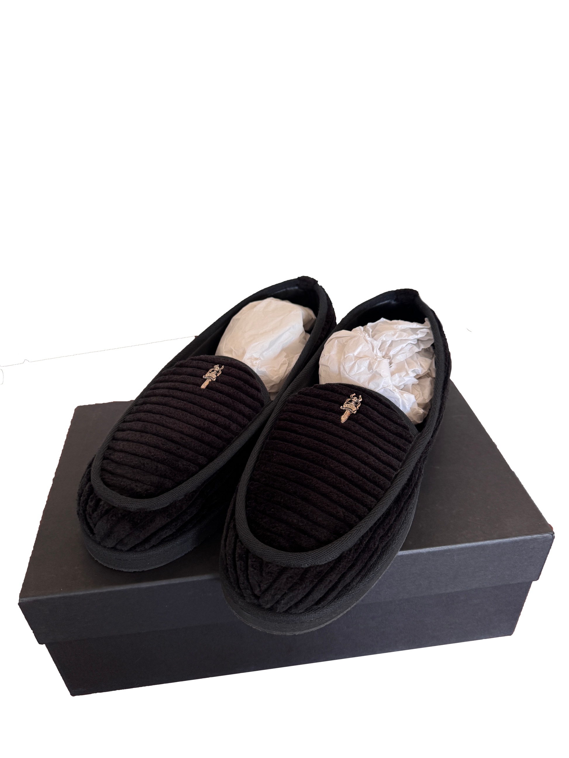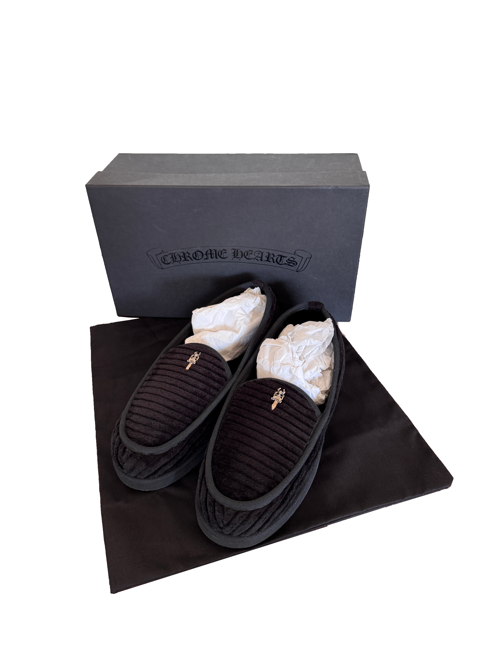 Highly sought-after piece of loungewear from Chrome Hearts. Soft corduroy slippers with a dagger on the frontside of the tongue, and a thin rubber monogram-tread outsole. These shoes have never been worn. Marked size 44, which is an 11 US. Comes with box and canvas dustbag.