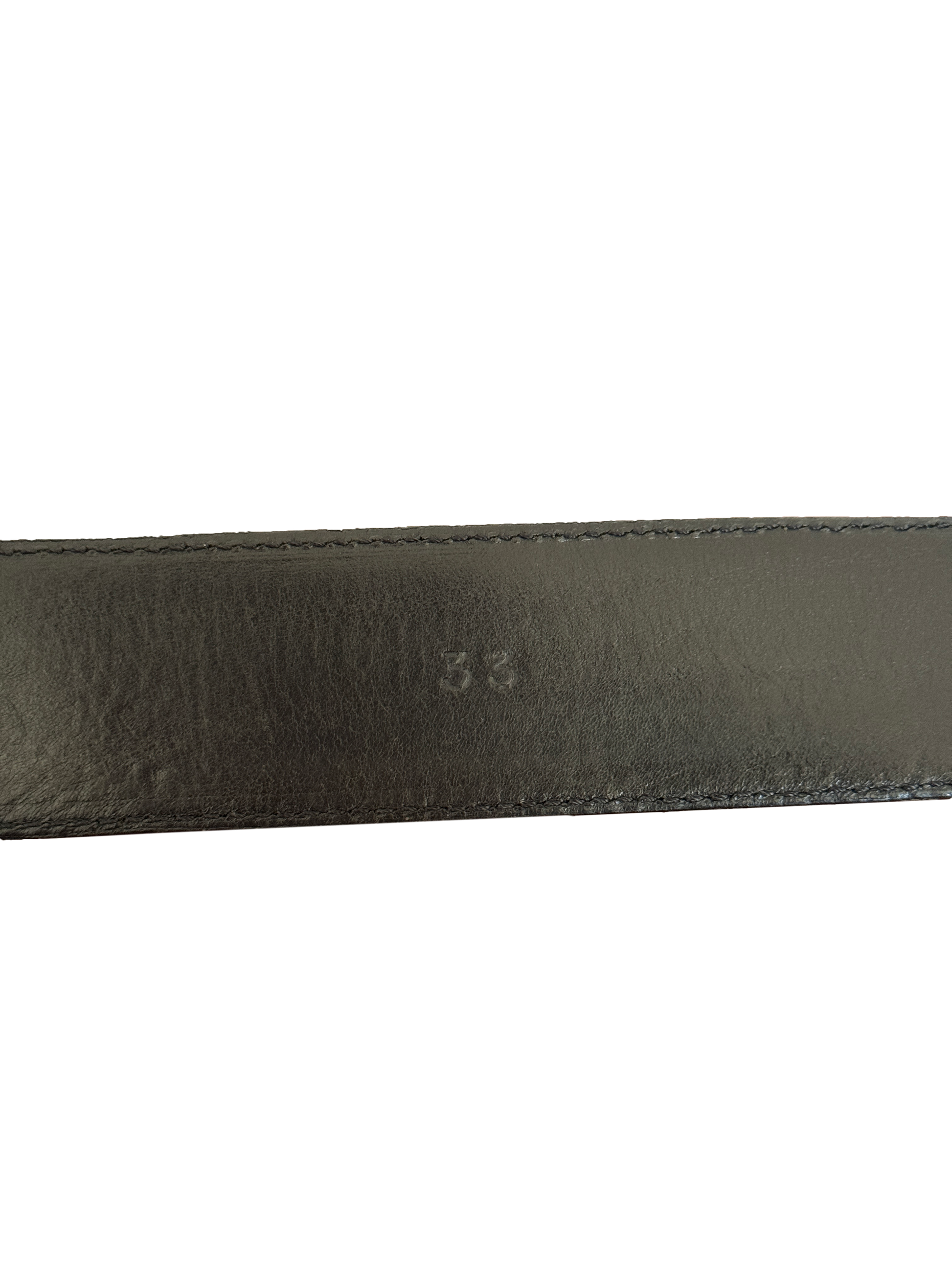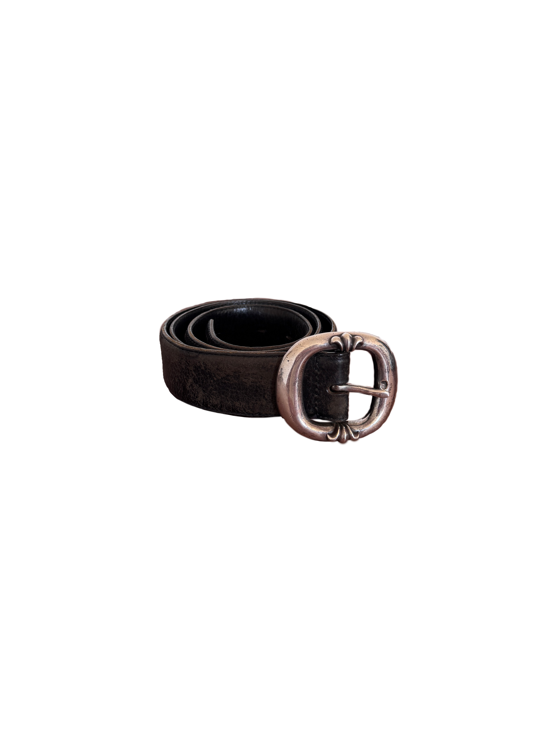 Classic belt from Chrome Hearts. Standard size gunslinger buckle on a 1.5” Black leather belt strap, marked size 33. The belt is in used condition, with some cracking of the leather, and scuffs on the buckle - otherwise, the belt is in overall great shape and ready for its next owner.